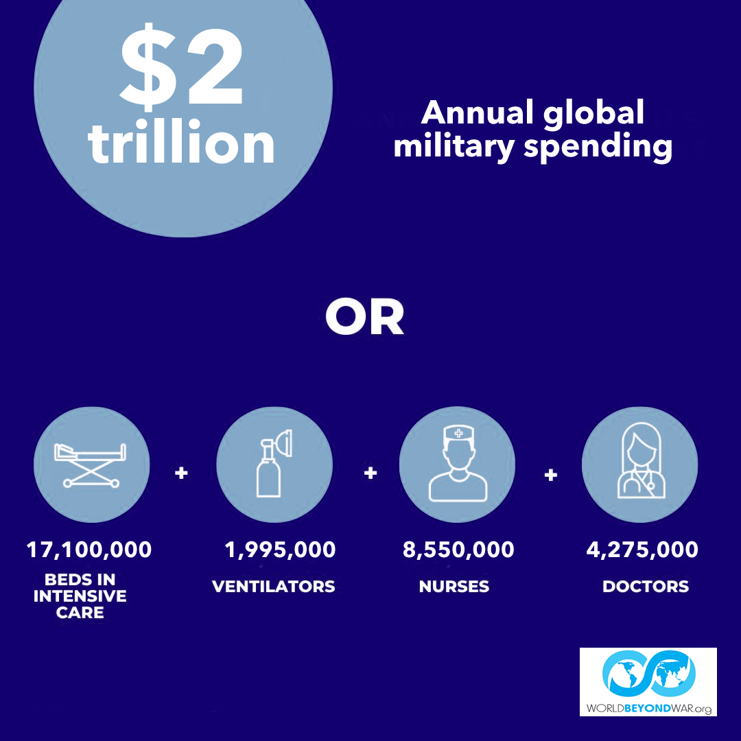 The microscopic little virus, just like the men with boxcutters on airplanes, is simply not addressed by military spending. On the contrary, the environmental destruction of militarism and of the dominant global culture as a whole very likely contributes to the mutation and spread of such viruses. Factory farming and carnivorism likely contribute as well. And at least some diseases, such as Lyme and Anthrax, have been spread by military labs doing openly offensive or supposedly defensive work on bioweapons.