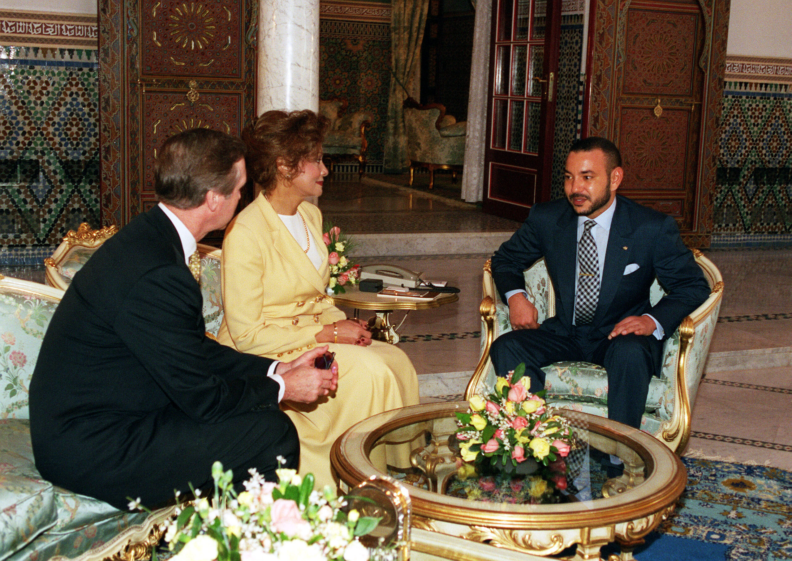 000211-D-9880W-134Secretary of Defense William S. Cohen (left) and his wife Janet Langhart Cohen (center) meet with King Mohammed VI, of Morocco, at his palace in Marrakech, on Feb. 11, 2000. Cohen and the King agreed to open an expanded security and defense dialogue, and discussed ways that Morocco could expand its leadership role in promoting regional stability in the Mediterranean and on the African continent. DoD photo by R. D. Ward. (Released)